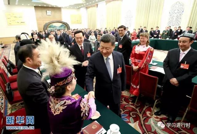 3月10日,中共中央总书记、国家主席、中央军委主席习近平参加十二届全国人大五次会议新疆代表团的审议。这是习近平同代表亲切握手。新华社记者 马占成 摄