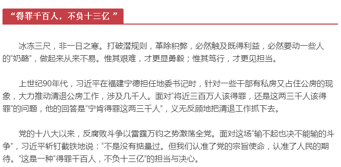 时光流转,不变的是初心。在习近平看来,要算人心向背、强党兴国的政治账,要算人民拥护不拥护、赞成不赞成、高兴不高兴、答应不答应的民心账,要算政通人和、健康发展的长远账。惟其如此,才会有刀刃向内的自我革命精神,才会有“虽千万人吾往矣”的豪迈气概,才会有“不破楼兰终不还”的坚强意志。 人心是最大的政治,正义是最强的力量。当干部升迁从靠“上头有人”变成了靠实绩说话;当“红包敲门”变成了依法依规办事,点燃的是人们的信心与希望。调查显示,人民群众对党风廉政建设和反腐败工作的满意度,由2012年的75%逐年攀升至2016年的92.9%。这条上升的曲线,标注的是人心所向,是社会文明进步的大趋势。 四海八荒,正道沧桑。打破潜规则、遵行明规则,是中国共产党人凝魂聚气的必修课,也是我们民族向上向善的必然选择。(来源:新华社) |