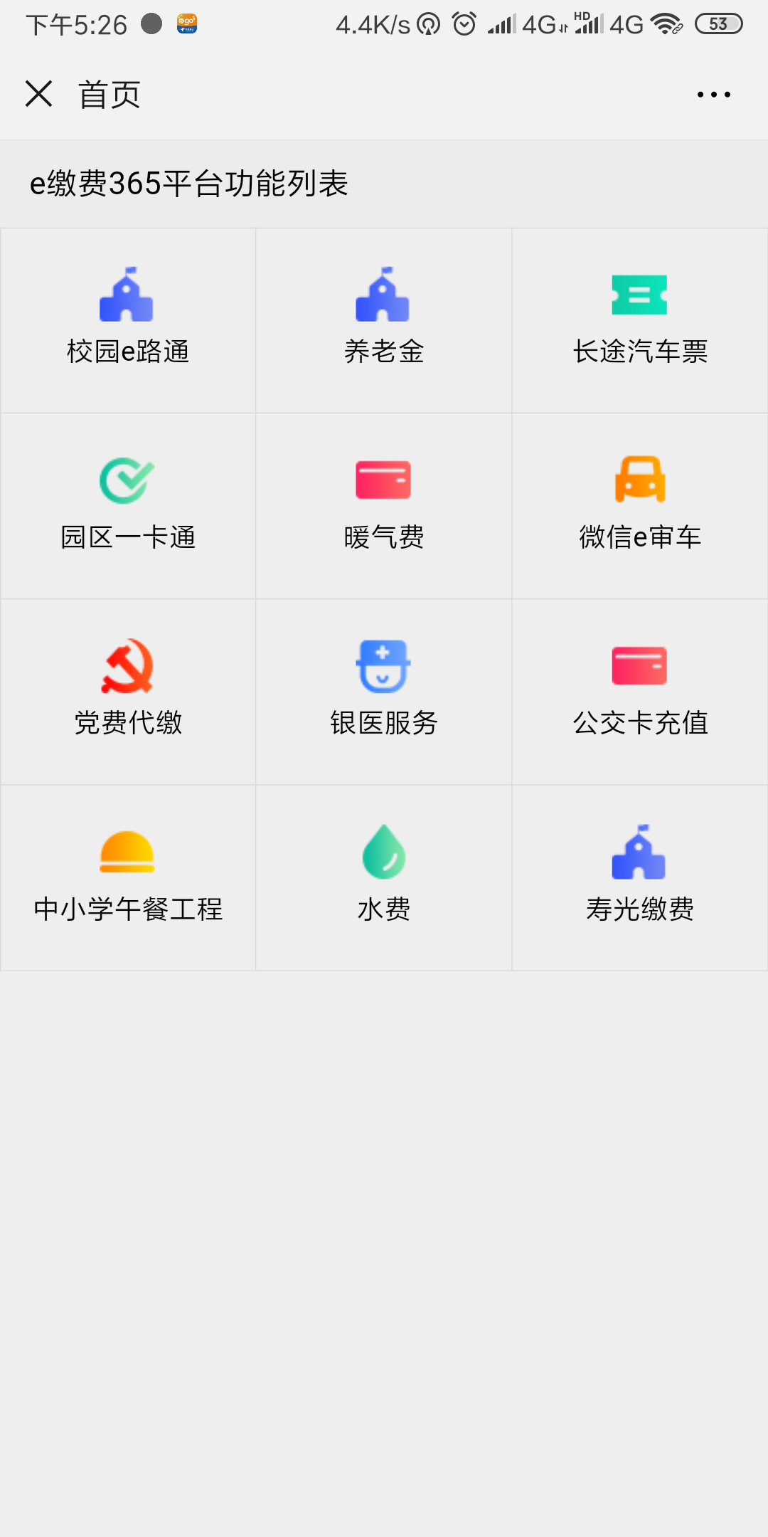 图1 1、扫描成功后,点击【业务办理】,选择e缴费365,随后选择校园e路通,页面如图1所示,进入下一页菜单,再如图2 所示:选择【缴费】菜单, 【城市】下拉列表中选择【泰安】,【单位】下拉列表中选择【开云网页版】,输入编号(学生身份证号)、输入姓名,点击【查询】。