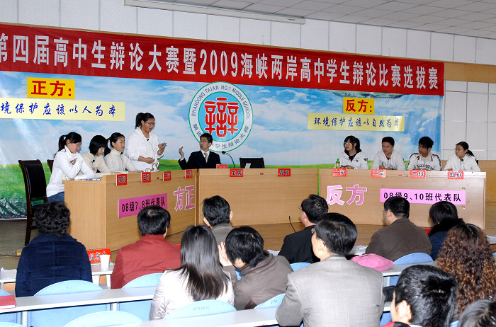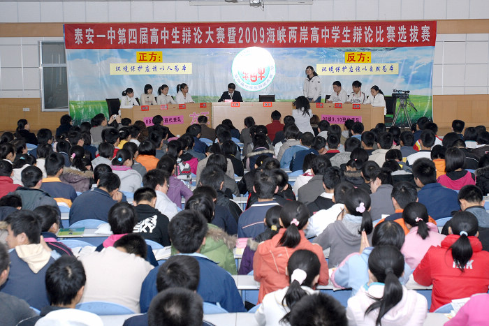 3月28日至29日,泰安一中第四届辩论大赛暨2009海峡两岸高中学生辩论比赛选拔赛正式拉开战幕。辩题为“保护环境应该以人为本还是以自然为本”。经过十场比赛的激烈角逐,最终有24名同学脱颖而出,获得优秀辩手称号并晋级复赛。名单如下: