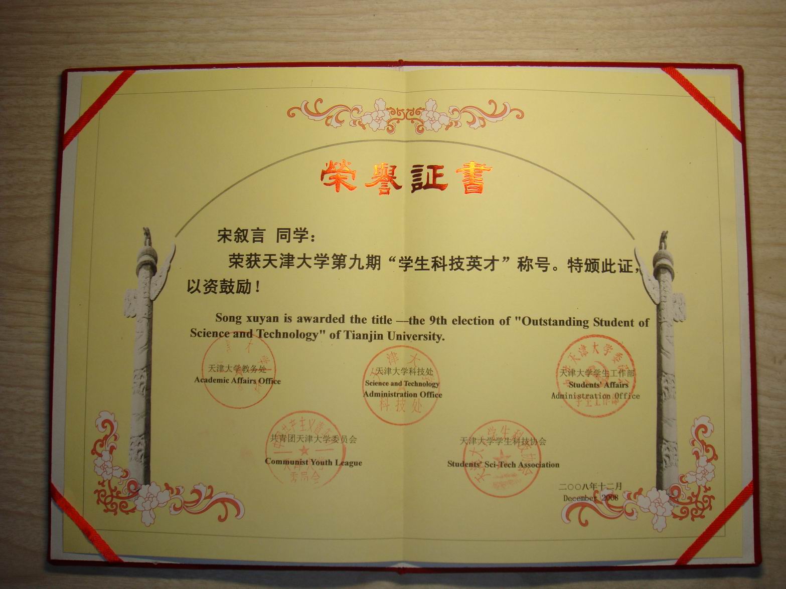 我校2006届毕业生宋叙言同学进入天津大学后展示出了优良的综合素质,表现出了较强的管理才能、实践能力和创新意识。2008年,他被学校聘为第六届学生社团团委书记,个人先后荣获2008年天津市大中专生暑期社会实践活动先进个人(全校仅10人获此奖,评选范围为天津市)、2008年天津大学学生志愿者暑期社会实践活动优秀社会实践报告一等奖、天津大学第九期“学生科技英才”称号(全校仅70人,从全部本科生、硕士生、博士生共3万人中评出)。