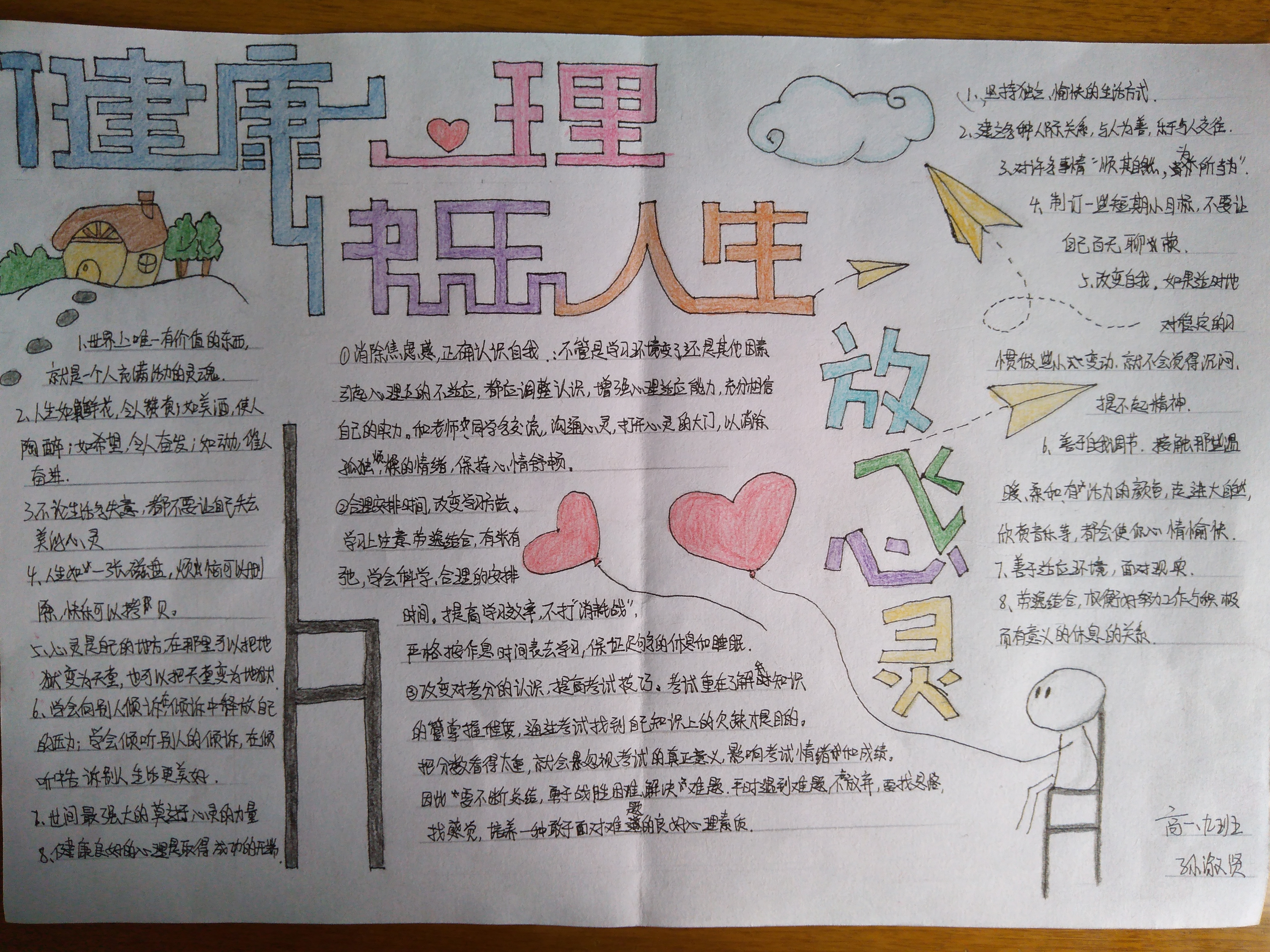 为了更好地普及心理健康教育常识,提高学生的心理自我调节能力,丰富学生的文化生活.近期,泰安一中开展了心理健康手抄报比赛活动。 本次手抄报活动的主题以心理健康教育常识为主,各班心理委员精心组织,同学们积极参与, 借助手中的画笔绘制成了一幅幅版面精美、内容丰富、布局新颖、短小精悍、书写清晰的手抄报作品。心理咨询室的老师和美术办公室老师组成了评审小组,经过认真的评比,本次心理健康手抄报比赛,评出一等奖15人,二等奖14人,优秀奖13人。 2021年心理健康手抄报比赛获奖名单: 一等奖15人 李怡然 王欣然 欧阳佳凝 张泽瑞 梁佳琪 马静怡 宋辰宇 王晓宇 孙淑贤 刘雅茹 王姿媛 张旖旎 王业凡 王雨菲 高 丰 二等奖14人 潘光耀 郭轩辰 李新实 和怡君 张建伟 侯韵函 杨一帆 张仁泽 赵 晨 王俊瑞 王文硕 褚心月 孙玉涵 吴再格格 优秀奖13人 张骞宇 刘旺运 张宪政 韩梦飞 张子恒 张凡锐 吕奕麟 马明阳 赵嘉丽 吕博文 次珠旺久 尼玛曲珍 桑吉卓玛 【部分获奖作品展】